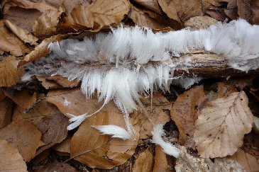Wird es nun sehr kalt, gefriert das Wasser im Holz. Das Gefrieren beginnt natürlich an der Oberfläche, es bildet sich zunächst sozusagen ein „Eispickel“. Die Kälte „wandert“ weiter nach innen ins Holz. Das innen ständig neu gebildete Eis hat bekanntlich ein größeres Volumen als Flüssigwasser und schiebt deshalb die fertigen, äußeren Kristalle vor sich her. Letztlich wirkt sich das so aus, dass fadenförmige Eiskristalle durch die Poren nach außen wachsen. Ein Pelz aus Eiskristallen entsteht. In der Literatur wird die Ausdehnung des Wassers nicht mehr als ausreichende Erklärung betrachtet. Es gibt demnach auch Hinweise darauf, dass das Kammeis durch winteraktive Pilze hervorgerufen wird. Diese geben atmungsbedingt CO2 ab, welches das gefrorene Wasser aus dem Holz treibt. Dieser „Raureif“ ist (anders als der klassische Raureif) somit ohne atmosphärische Luftfeuchtigkeit entstanden. Das ist auch der Grund, weshalb man solche Stücke auch im schnee- und raureiffreien Wald herumliegen sieht. Nur richtig kalt muss es sein, und das Holz muss von Pilzen befallen sein. Wir haben uns übrigens aus dem Wald das Holzstück aus Bild 2 mitgenommen und so in den Garten gelegt, dass wir es vom Küchenfenster aus sehen können. Es dient in unserem Garten quasi als untrüglicher „Frost-Finder“.